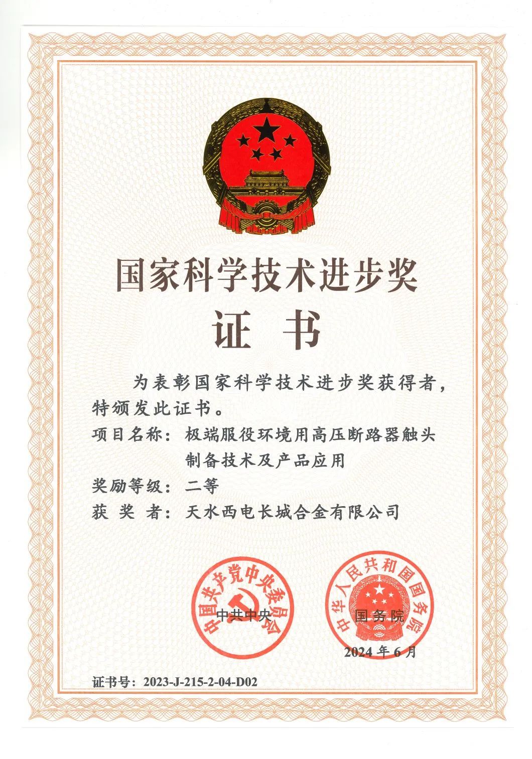 天水合金1項(xiàng)成果榮獲國(guó)家科學(xué)技術(shù)進(jìn)步獎(jiǎng)二等獎(jiǎng)