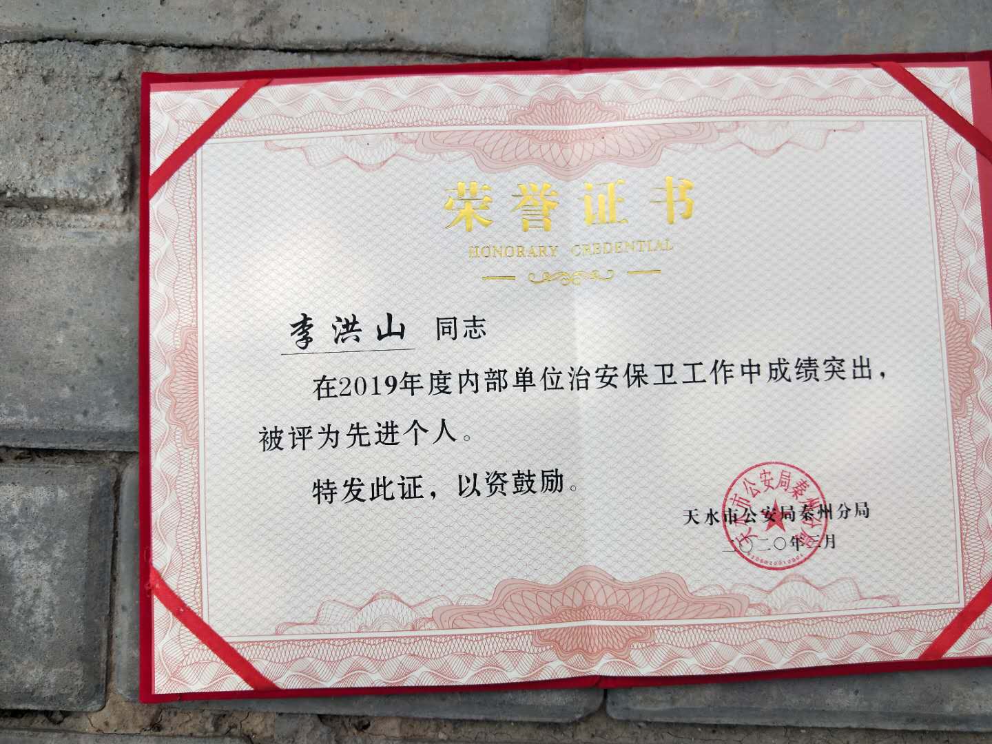 天水合金李洪山榮獲天水市公安局秦州區(qū)分局治安保衛(wèi)工作“先進個人”榮譽稱號